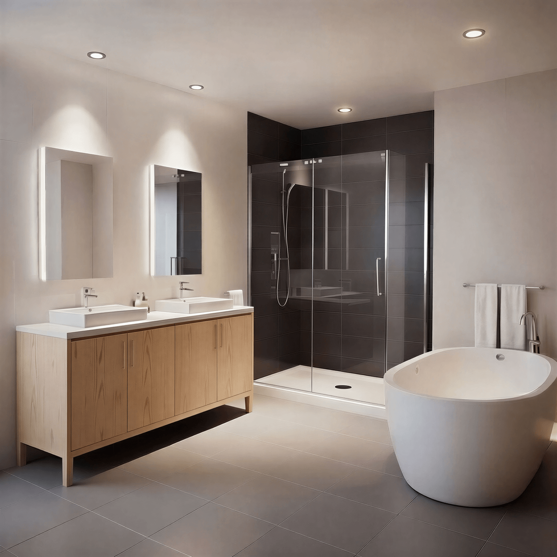 The bathroom blends elegance with functionality, featuring carefully selected finishes and materials that elevate the everyday experience. Soft lighting and contemporary fixtures create a spa-like feeling while maintaining durability and practicality.